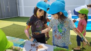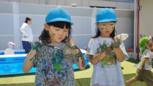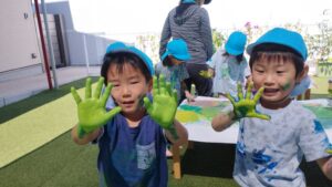 手から腕、顔にまで絵具をつけたり、子ども同士や先生に付け合ったり、ダイナミックに遊びを楽しむことができました🌟