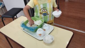 そら組では、5歳児さんがご飯をよそい、お当番さんが配膳します(^^)