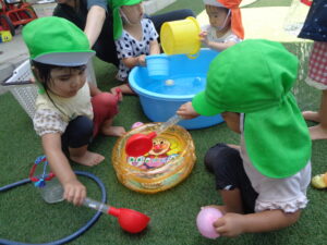 たらいの水をすくって友だちと掛け合ったり、跳ね返ってくる水に喜んだりとキャッキャと楽しんでいましたよ。