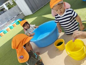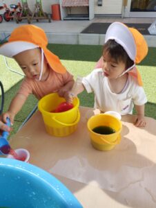 ペットボトルに色水を入れ、ジュースに見立てて飲む真似をしたり、バケツから容器に移したりして、楽しんでいました👏