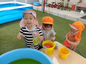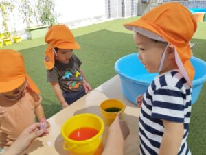 ひまわり組では、朝の会の後、色水遊びをしました😊
