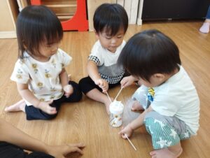 色水遊びを楽しんだ後は、しっかり、水分補給をし、お部屋の中で遊びました。