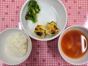 今日の給食は、ご飯とほうれん草のキッシュ、トマトのコンソメスープ、ブロッコリーのレモンサラダでした。