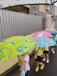 さて今日は雨でしたが、そら組さんは傘をさしたり、長靴を履いたりしてルンルンで松縄町園へダンスの練習へ行ってきました🎵