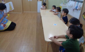 今日のめろん組さんは栄養士さんから食育指導を受けました。「好き嫌いしないでたべる」、「いただきますのお約束」のお話を聞きました。絵本を読んでもらい、「たまねぎ~」「みかんだ~」「パンケーキだ~」と興奮気味の子どもたちでした。お話しを上手に聞けるようになっていますよ。