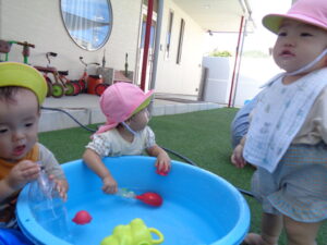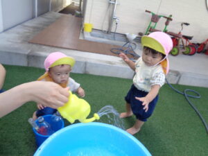 水遊びをスタートしたばかりの時には水の冷たさに驚いて泣いてしまうこともあったいちご組さんですが