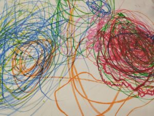 保育者が「何描こうかな?」と言うと「花火!」と言って赤い花火、青い花火を大きく描いてくれる子もいました。