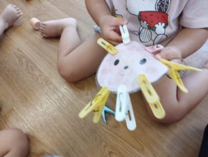 洗濯ばさみを付けたり除けたりして遊びました。なかなかできない子も保育者と一緒に諦めず出来てニコリ😊とってもうれしそうでした。