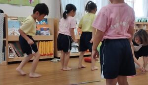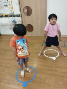 ダンスがありました。アイドル♪の曲に合わせて踊りましたよ。まずは、輪っかを使ってグー✊パー✋と跳びウォーミングアップ!
