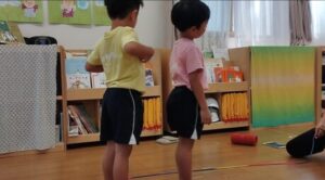 次は大繩にチャレンジ!講師のグー✊パー✋の合図に上手に、足を閉じたり開いたり、跳ぶことにみんな集中。
