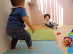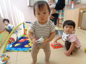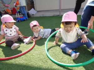 園庭では、ハイハイしたり歩いたりと活発に遊んでいました。