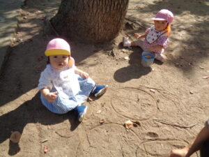 入れ物に、たくさん小石や落ち葉を集めて楽しんでいました。