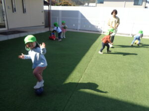 保育者が鬼になり子どもたちを追いかけますが、なかなか手強い子どもたち。