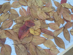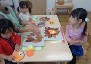 先日公園に行ったときにいろいろな色の葉っぱを拾い集めました。子どもたちは、「せんせい~、あかだよ」、「きいろ~」など保育者とのやりとりを楽むことができるようになりました。
