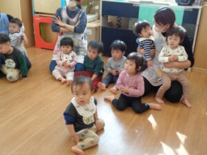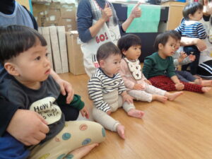 いちご組さんのまだ9か月のお友だちが「I」」(そう聞こえました🌞)と声を出しながら何度も手をあげていたのにびっくりしました。タイミングもばっちりです。イラストと先生の言葉をしっかり見たり聞いたりしているんですね。他のお友だちもその声や雰囲気につられて楽しんでいましたよ。