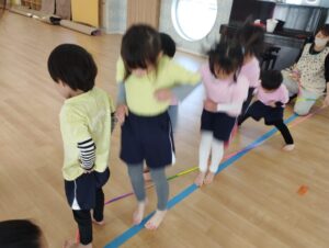 3.4歳児さんは、線の上に立って、まっすぐ上に飛ぶ練習をしています😲
