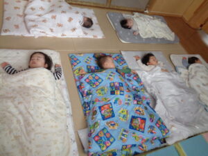 たくさん遊んでおなか一杯給食を食べた後は、すやすやお昼寝です☺