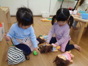 室内ではままごとをして遊びました🍳エプロンを付けてママになりきっています♪♪