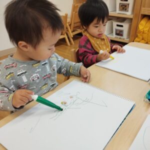 保育者が「お絵かきする人?」と尋ねると、元気に「はーい」と答えが返ってきたらお絵かきの始まりです。