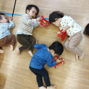 だんだん身体を動かしたくなってきたひまわり組さん。タンバリンを持って、歌に合わせて踊りました。一人がシャラシャラ鳴らしながら部屋をグルグル歩き始めると、追いかけるようにみんなでグルグル、シャラシャラが始まります。「サンタが街にやってくる」の曲では、なぜかみんな寝てしまいました。