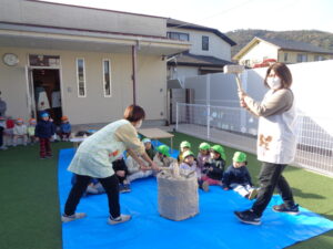 さて、今日はそらぐみとめろんぐみで「もちつきごっこ」をしました。