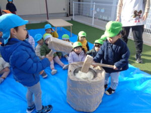 次は子ども達の番です。「よいしょ!それ!」というかけ声と共に、順番に餅つきを楽しみました!