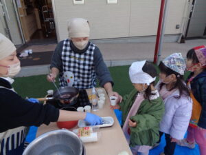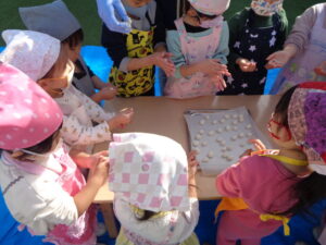今日はもちつきごっこなので、小麦粉粘土をお餅に見立てて遊びました。まるで本物のお餅のようにふわふわで柔らかい感触に「わぁ!」と声が上がりましたよ。