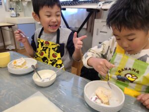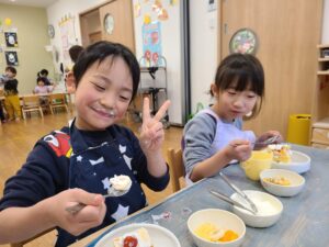 生クリームは、5歳児さんが、みんながお昼寝をしている間に泡立ててくれました。