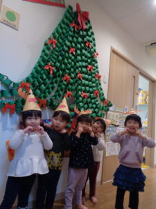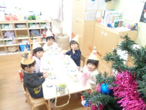 クリスマス会の余韻が冷めないめろん組さんは、帽子を被ったままクリスマスパーティーをすることにしました。ツリーを眺め、音楽を聴きながら食べる給食は最高でした♪
