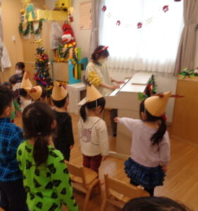 そら組さんは「うさぎ野原のクリスマス」を披露し、保育園が素敵な演奏や歌声に包まれていきました。