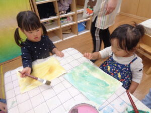 雪が浮かび上がると「わぁ~絵の具の中から絵がでてきたよ!」と驚く姿も見られました😊