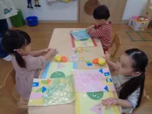 この2つの形を使って家を作ってもらいました。どんな家がいいかなぁとイメージを膨らませながら楽しく作ることができました💕