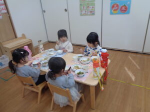 自分のことは自分でしてみようと、荷物の片づけやお箸の練習、トイトレなど一人ひとりの成長に合わせてがんばっているところです。