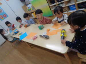 どのクラスも節分に向けて、製作をしています。めろん組も今日は製作からスタートです。
