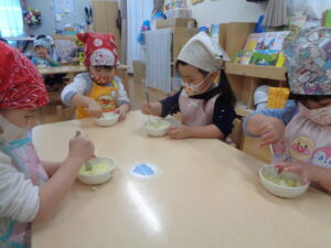 その後は、待ちに待ったクッキングです。昨日から「楽しみ~」と言って待ち遠しくしていた子どもたちです。