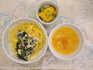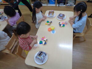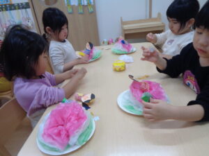 その後は、ひな祭りの製作をし、のりや両面テープを使って貼りつける作業をしました。指先を器用に使えるようになった子どもたちです。とても可愛らしお雛様が完成しました😄