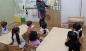 めろん組では、ひな祭りの絵本を読んで、みんなでひな祭りの歌をうたいました。歌詞を覚えて上手にうたえていましたよ。