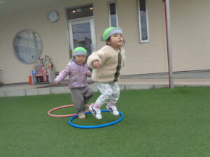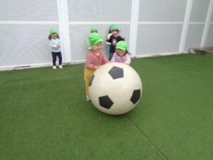 製作をした後は、雨上がりの園庭にでて、体をいっぱい動かしました。二人ずつペアになって、大玉転がしをしました。二人の力を合わせて、コロコロとボールを転がします。まっすぐ転がらないときも力を合わせます。後ろにいるお友だちは、「がんばれー」と応援する姿がありました。仲間意識が垣間見れるようになっためろん組の子どもたちです。