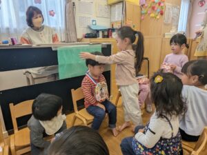 めろん組の3月生まれのお友だちに、「おめでとう」と言ってプレゼントを渡していました。