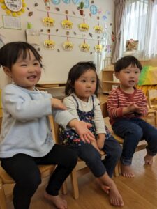 会が終わると、保育者と一緒に手遊びをして遊びました。保育者の手の動きをよーく見て真似っこをする子どもたちでした。