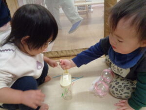 とっても細い棒や、ペットボトルのふたなど好きなものを選んでどんどん落としています。
