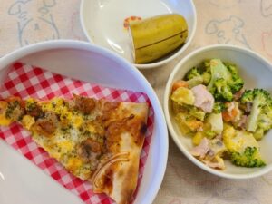 ピザでした。生地からすべて栄養士さんの手作りです。愛情のこもったピザは、おかわりが足りないくらい、たくさん食べました。