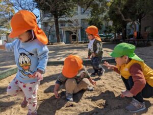 ひまわり組さんと一緒に公園に行き、天気も良くたくさん体を動かして遊びました。子どもたちはぶらんこに乗り、「もっともっと高く」と保育者に言って背中を押してもらい、高く上がることを喜ぶ姿がありました。砂場ではひまわり組さんと一緒に、砂遊びを楽しんでいました。