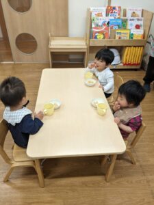少し高くなった机や椅子に座っておやつの時間🎵