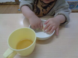 朝のおやつは自分で一粒ずつつまんで口まで運んで食べられていましたよ✨