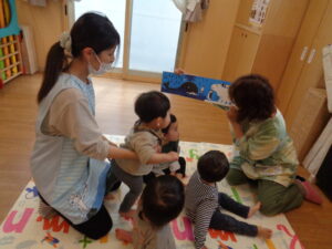 様々な色のクレヨンと動物が出てくる絵本を読んでもらうと最後まで目を離さず集中して見ていました。