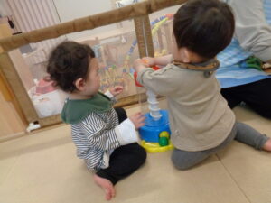 ころころとボールが転がっているところを見つめて、下まで落ちると保育者の方を見てにっこりする姿がとっても可愛かったです。