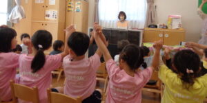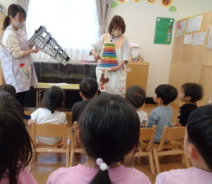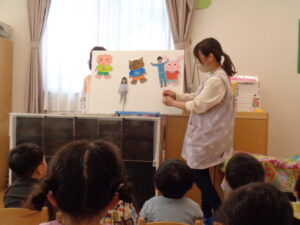 パネルシアター「いってきまーす!」では、「おはよう」と起きてきた動物たちがパジャマから着替えて元気にいってきまーす!最後は5月生まれのお友だちも登場しました!