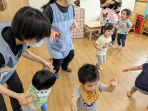 ピアノに合わせて、手遊びをしたり、音や大きさを体で表現しています😊