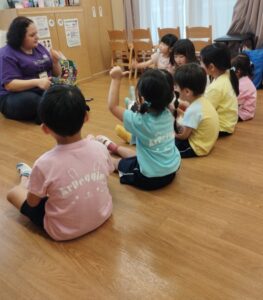 名前を呼ばれるときちんと手を上げて「はい!」と返事をしているお友だち。みんなもほっこりする雰囲気となり、緊張していた子も「How old are you?」少し恥ずかしそうにしていましたが、しっかり発音して答えることができました。